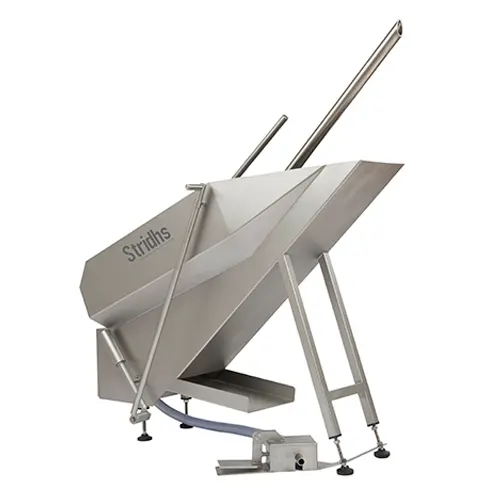 Diseñado para limpiar tripa gruesa después del desentrebinado y girarla completamente. Su tubo especializado asegura una limpieza total interna y externa, activada por un pedal. Fabricado en acero inoxidable, con diseño ergonómico y capacidad de hasta 80 tripas por hora, requiere un flujo de agua fría de ½”.